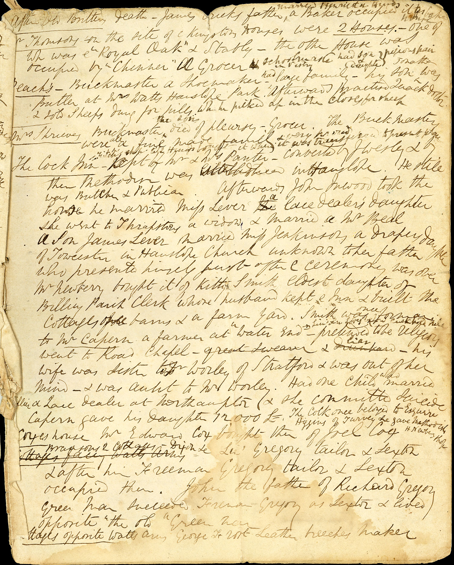THE COCK INN - Fitche's shop till Hindes bought it when it was transferred to present place - kept by Mr and Mrs Panter - converted by J. Wesley and by them methodism was established in Hanslope. He still was Butcher and Publican. Afterwards John Inwood took the house he married Miss Lever a lace dealers daughter. She went to Thrapston a widow and married a Mr Beal. A son James Lever married Miss Jenkinson a drapers daughter of Towcester, in Hanslope Church unknown to her father who presented himself just after the ceremony was over. Mr Newberry bought it of Kitty Smith eldest daughter of Billing Parish Clerk, whose husband kept the inn and built the cottages once barns and a farm yard. Smith was once a forman to Mr Capern a farmer at Water End - (Lincoln Lodge below Cuckhold hill) - pretended to be religious - went to Road Chapel - great swearer and drunkard - liar - his wife was sister to Mr Worley of Stratford and was out of her mind - and was aunt to Mr Worley. Had one child who married Hillier a lace dealer at Northampton and she committed suicide. Capern gave his daughter 12000 £ - The Cock once belonged to Esquire Higgins of Turvey he gave methodists H Newbery shop | See page 1 for Fitch's shop which was probably at No.16 High Street which this suggests was the site of the Cock Inn until it transferred it sometime before 1779 when a survey shows it on the