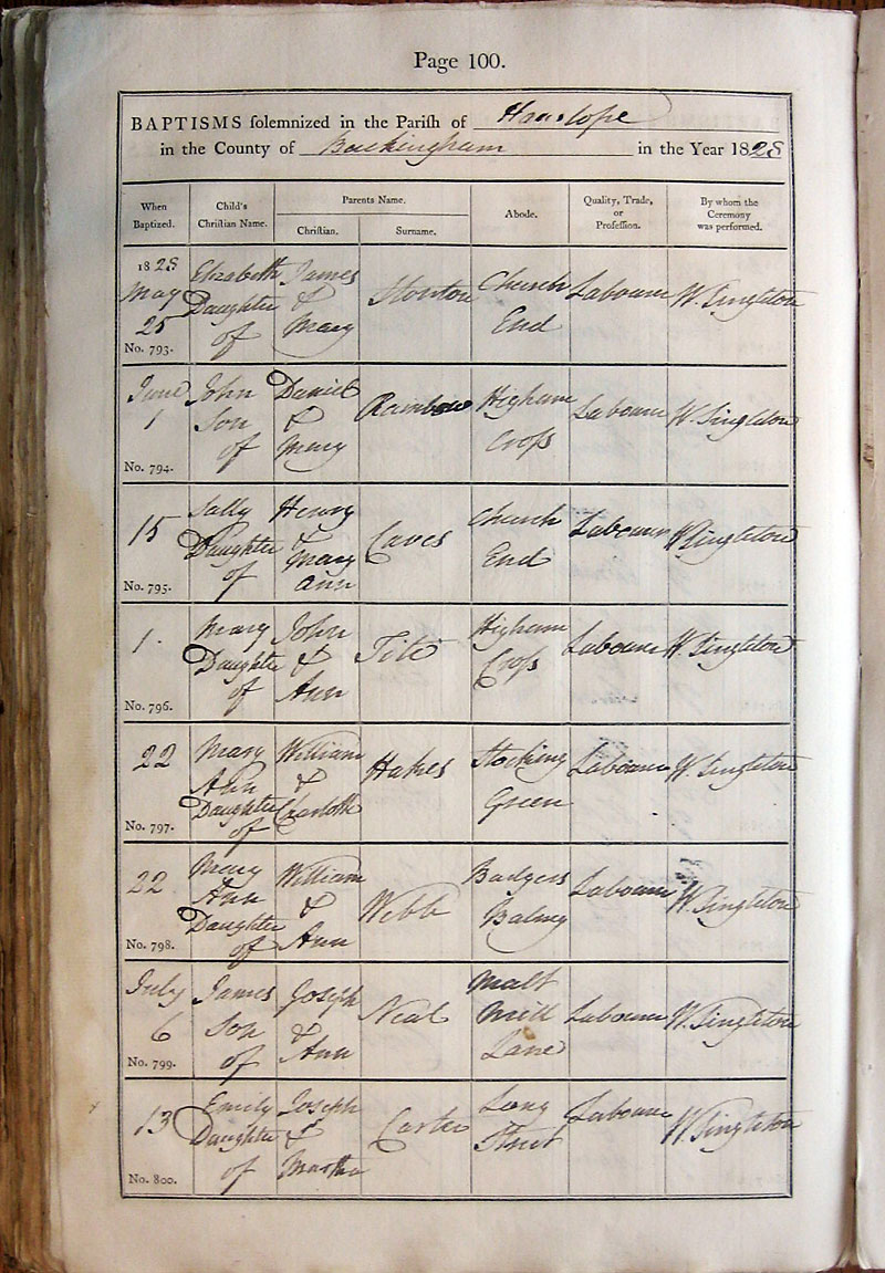 Below is a transcription and image of page 100 of the Baptism register for 1813-1845 of St. James The Great, Hanslope