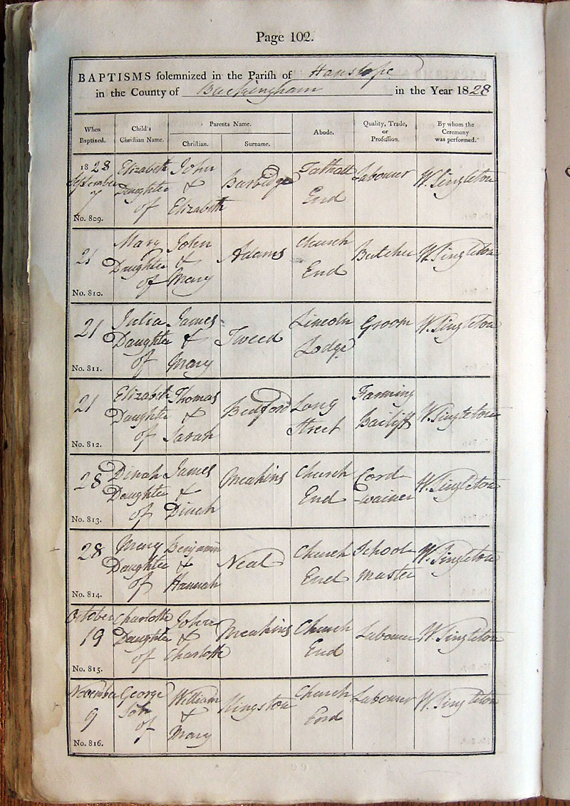 Below is a transcription and image of page 102 of the Baptism register for 1813-1845 of St. James The Great, Hanslope |
