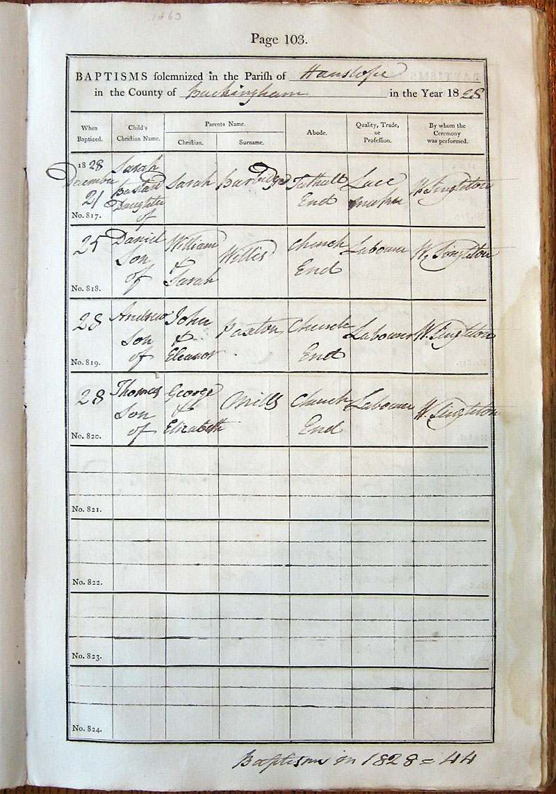 Below is a transcription and image of page 103 of the Baptism register for 1813-1845 of St. James The Great, Hanslope |