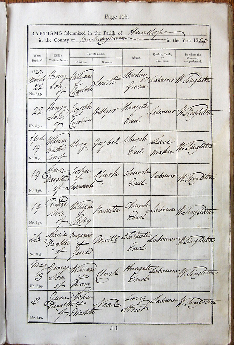 Below is a transcription and image of page 105 of the Baptism register for 1813-1845 of St. James The Great, Hanslope |