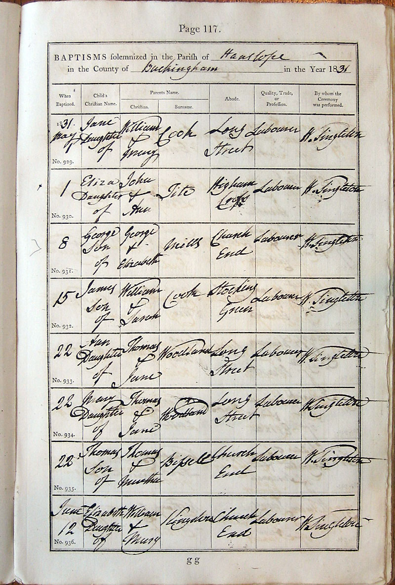 Below is a transcription and image of page 117 of the Baptism register for 1813-1845 of St. James The Great, Hanslope |