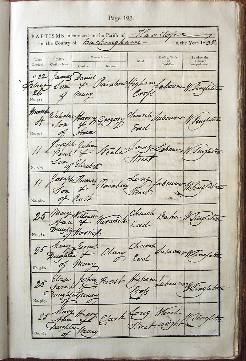 Below is a transcription and image of page 123 of the Baptism register for 1813-1845 of St. James The Great, Hanslope |