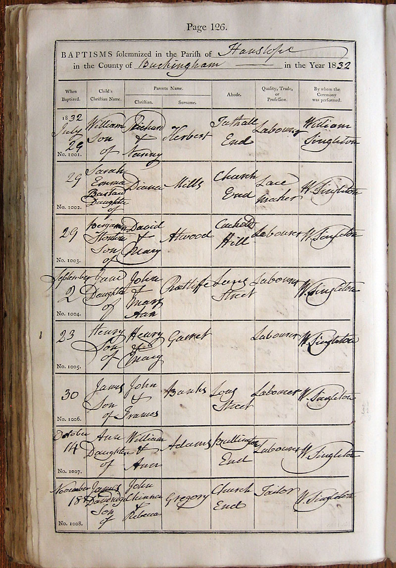 Below is a transcription and image of page 126 of the Baptism register for 1813-1845 of St. James The Great, Hanslope |