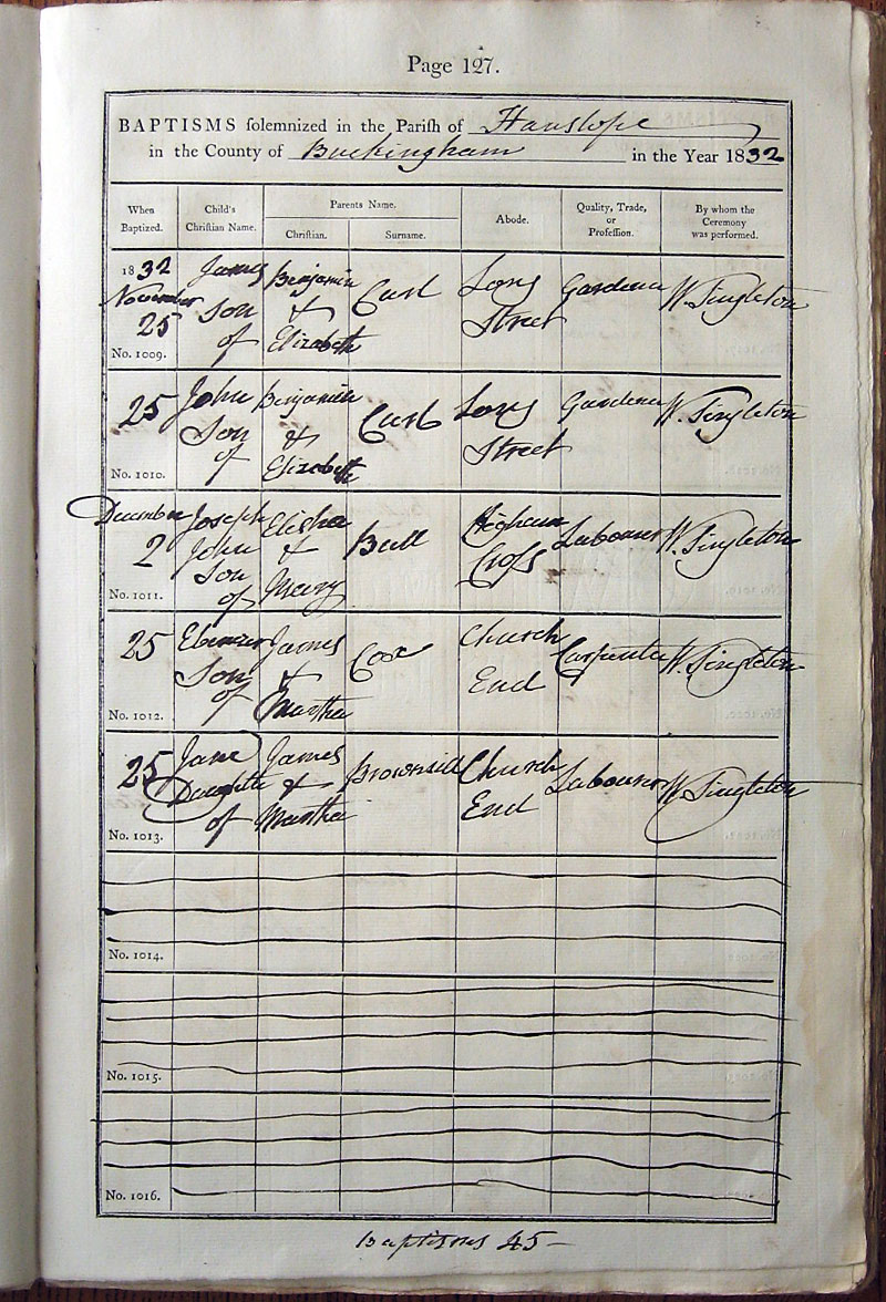 Below is a transcription and image of page 127 of the Baptism register for 1813-1845 of St. James The Great, Hanslope |
