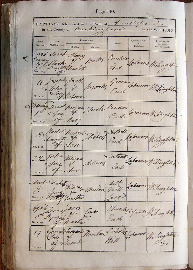 Below is a transcription and image of page 140 of the Baptism register for 1813-1845 of St. James The Great, Hanslope |