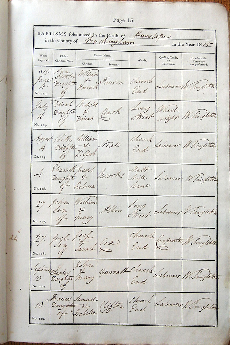Below is a transcription and image of page 15 of the Baptism register for 1813-1845 of St. James The Great, Hanslope