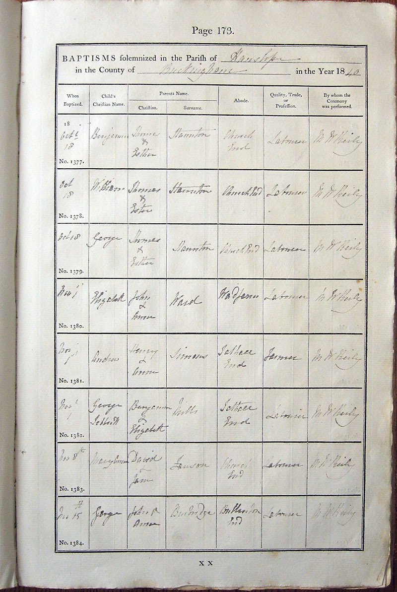 Below is a transcription and image of page 173 of the Baptism register for 1813-1845 of St. James The Great, Hanslope |