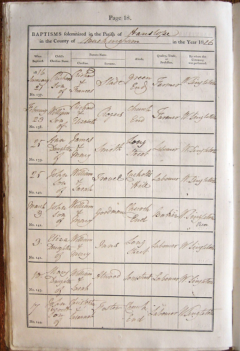 Below is a transcription and image of page 18 of the Baptism register for 1813-1845 of St. James The Great, Hanslope |