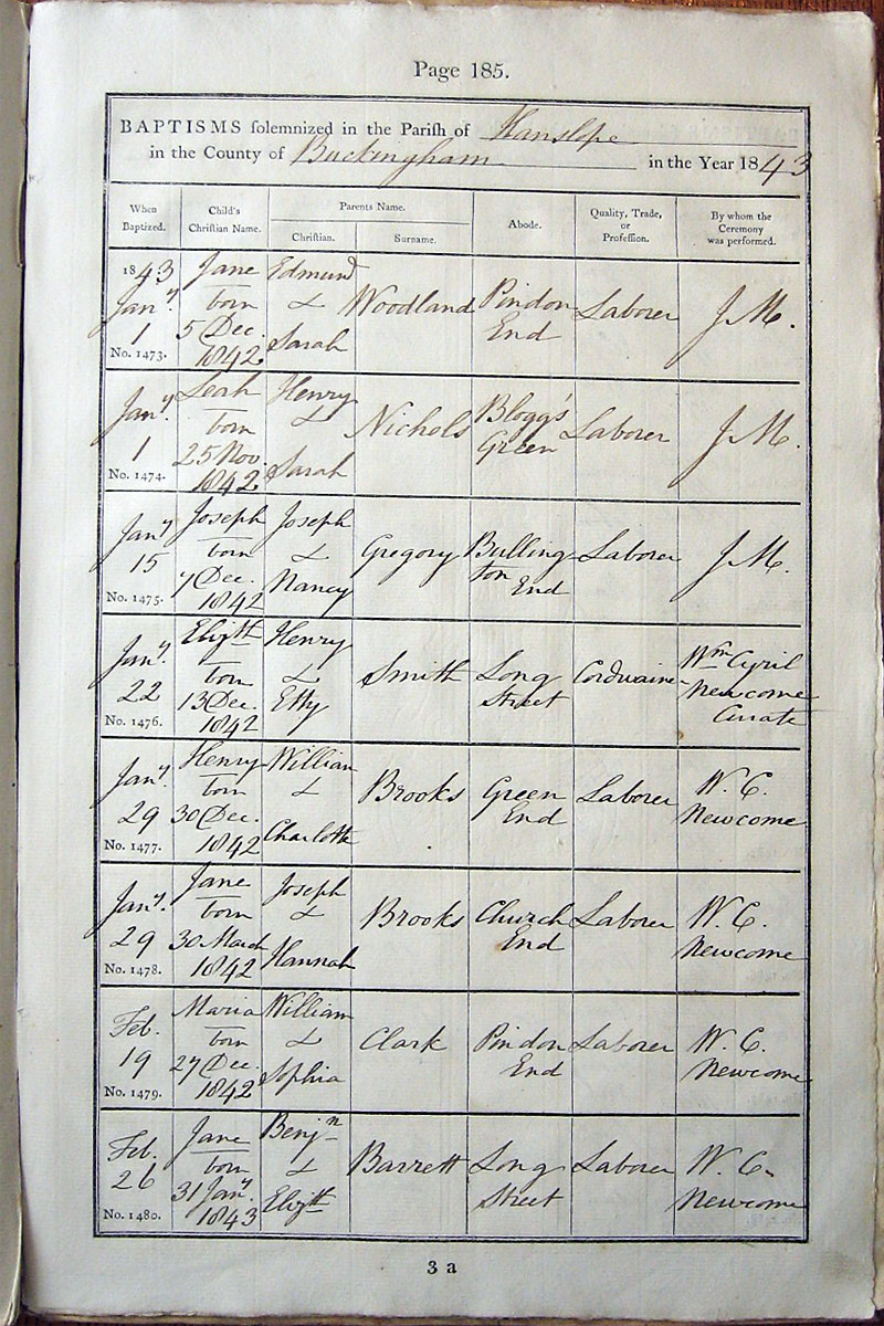 Below is a transcription and image of page 185 of the Baptism register for 1813-1845 of St. James The Great, Hanslope |
