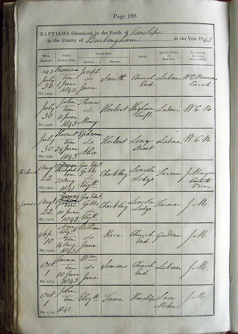 Below is a transcription and image of page 188 of the Baptism register for 1813-1845 of St. James The Great, Hanslope |