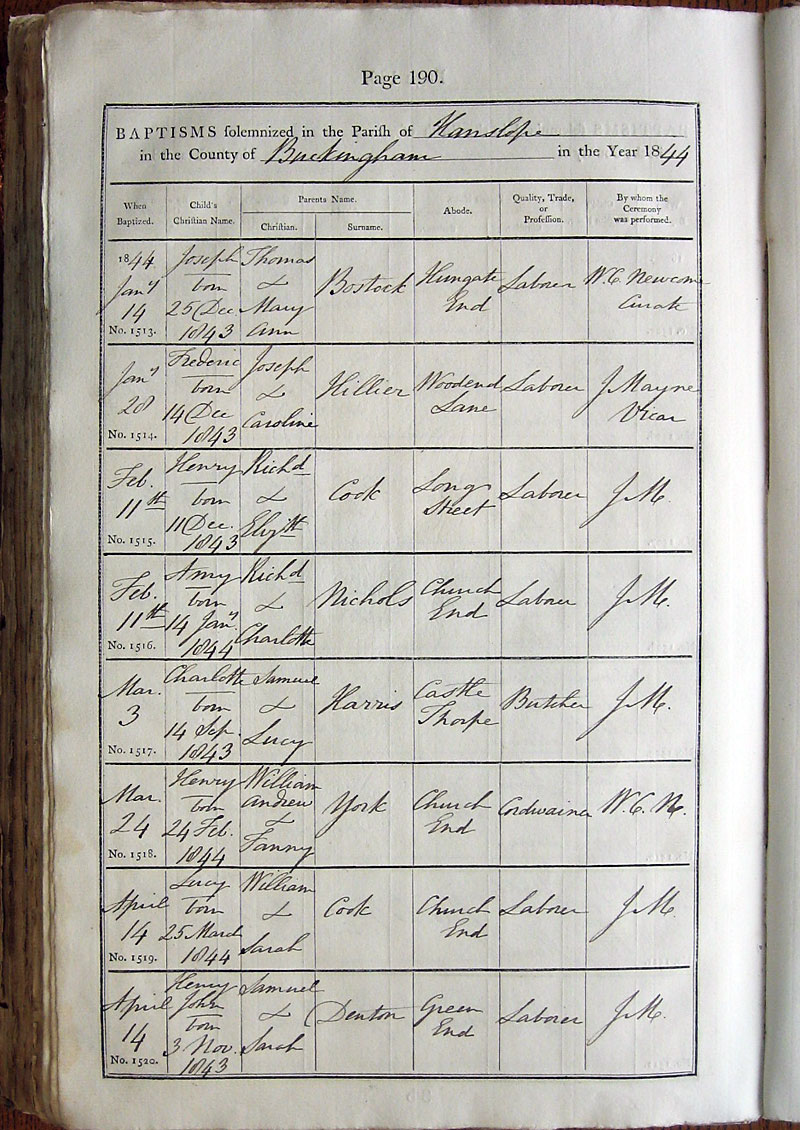Below is a transcription and image of page 190 of the Baptism register for 1813-1845 of St. James The Great, Hanslope |