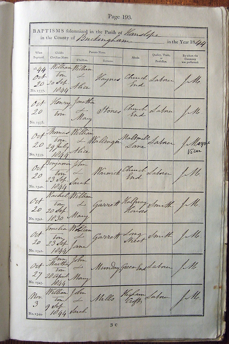 Below is a transcription and image of page 193 of the Baptism register for 1813-1845 of St. James The Great, Hanslope |