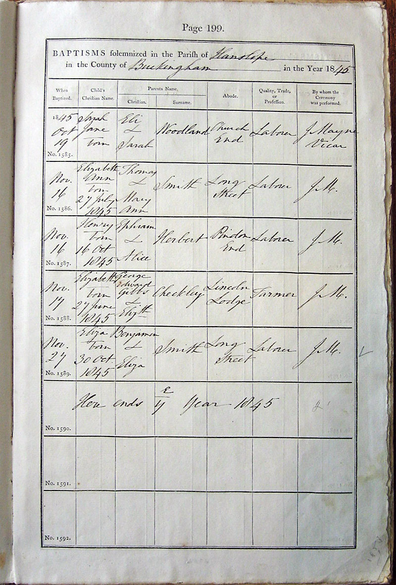 Below is a transcription and image of page 199 of the Baptism register for 1813-1845 of St. James The Great, Hanslope |