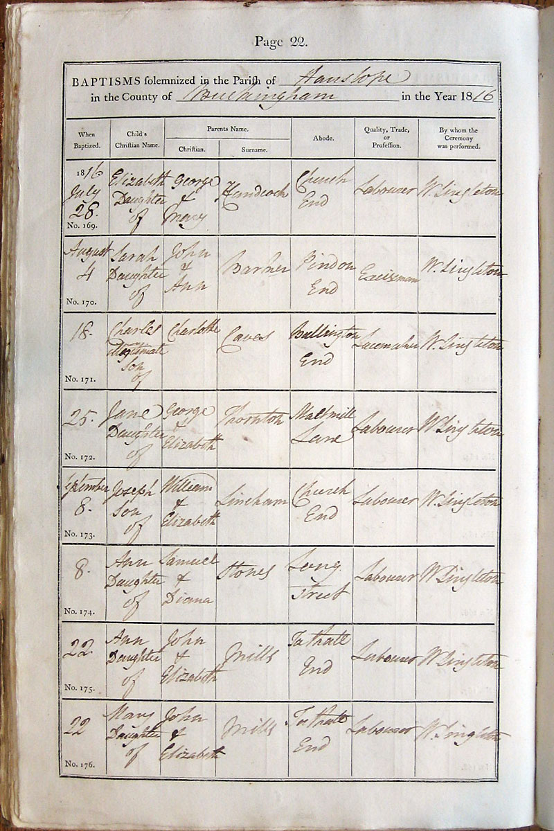 Below is a transcription and image of page 22 of the Baptism register for 1813-1845 of St. James The Great, Hanslope |