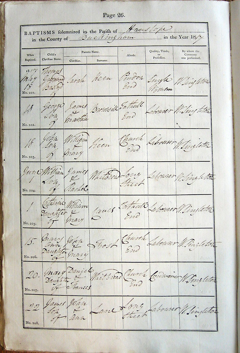 Below is a transcription and image of page 26 of the Baptism register for 1813-1845 of St. James The Great, Hanslope