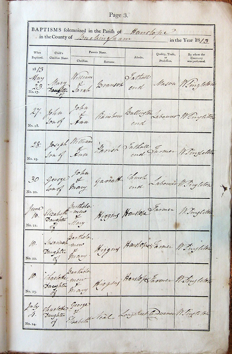 Below is a transcription and image of page 3 of the Baptism register for 1813-1845 of St. James The Great, Hanslope |