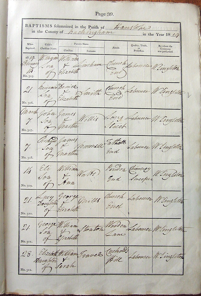 Below is a transcription and image of page 39 of the Baptism register for 1813-1845 of St. James The Great, Hanslope |