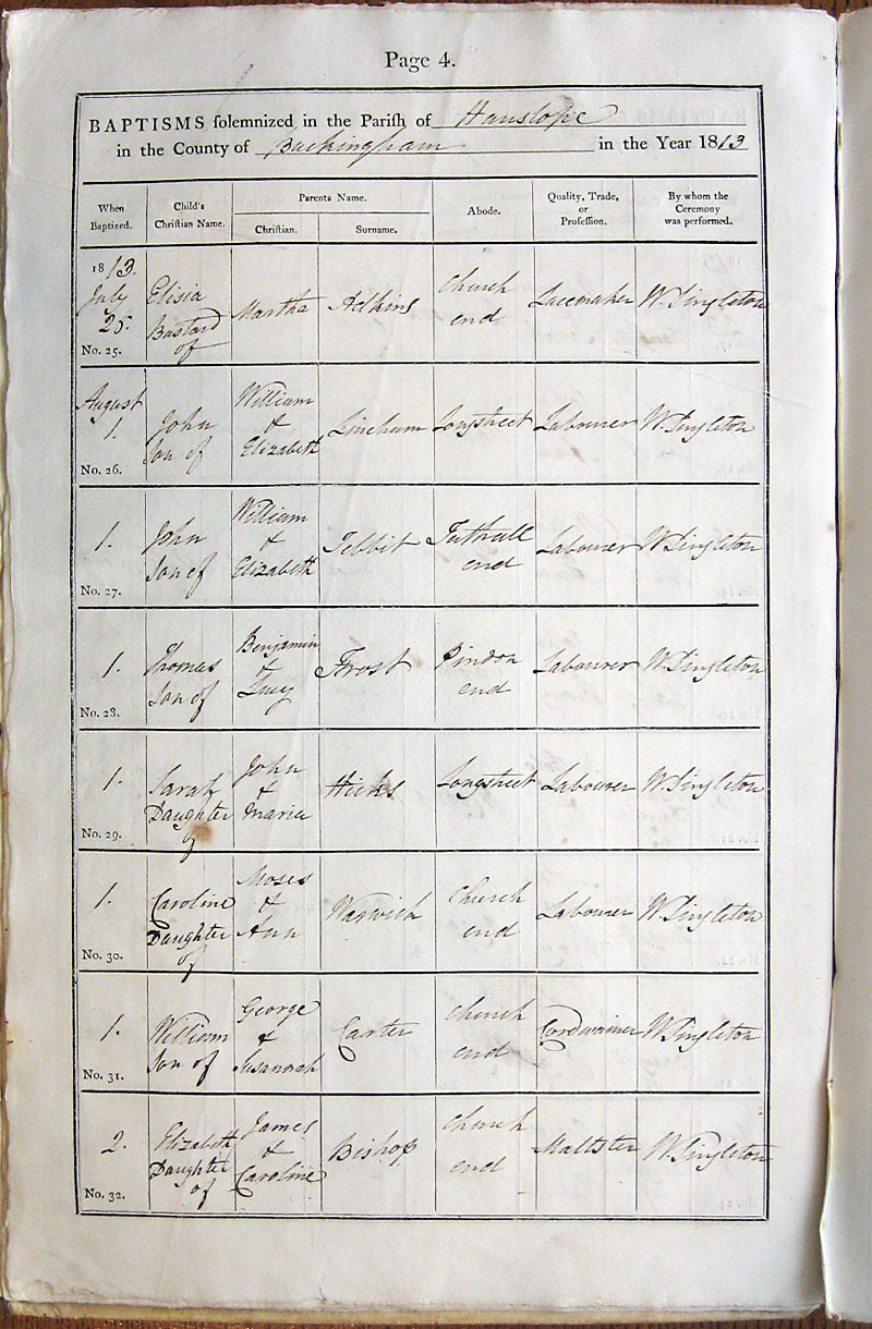 Below is a transcription and image of page 4 of the Baptism register for 1813-1845 of St. James The Great, Hanslope |