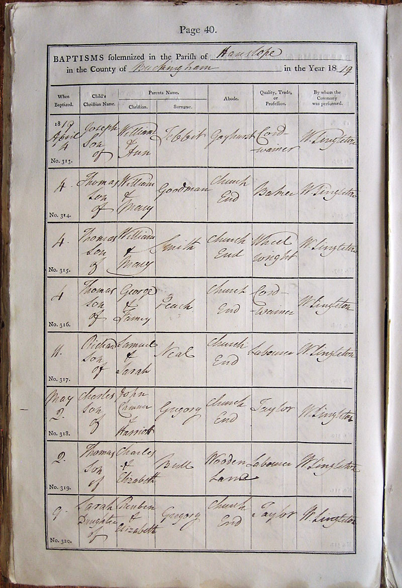 Below is a transcription and image of page 40 of the Baptism register for 1813-1845 of St. James The Great, Hanslope |