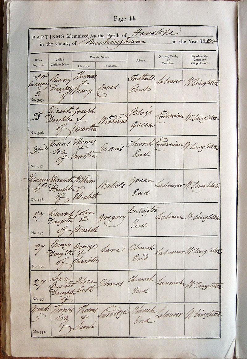 Below is a transcription and image of page 44 of the Baptism register for 1813-1845 of St. James The Great, Hanslope |