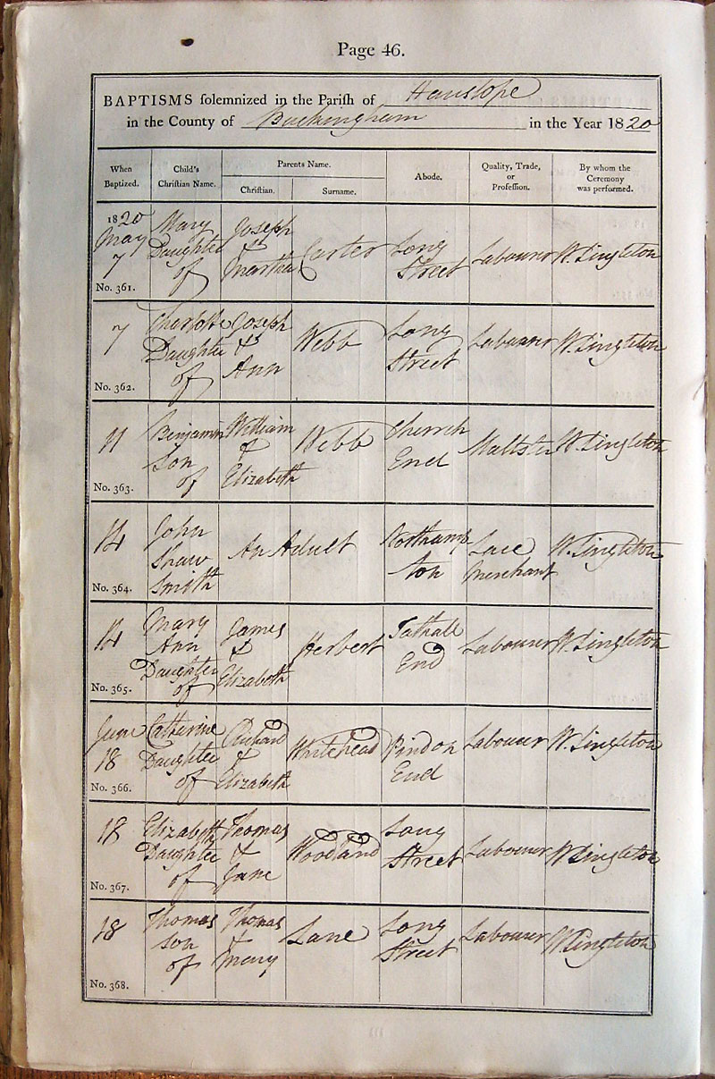 Below is a transcription and image of page 46 of the Baptism register for 1813-1845 of St. James The Great, Hanslope |