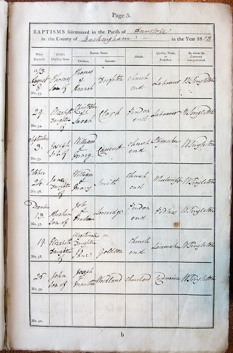 Below is a transcription and image of page 5 of the Baptism register for 1813-1845 of St. James The Great, Hanslope |