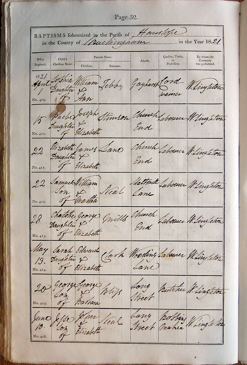 Below is a transcription and image of page 52 of the Baptism register for 1813-1845 of St. James The Great, Hanslope |
