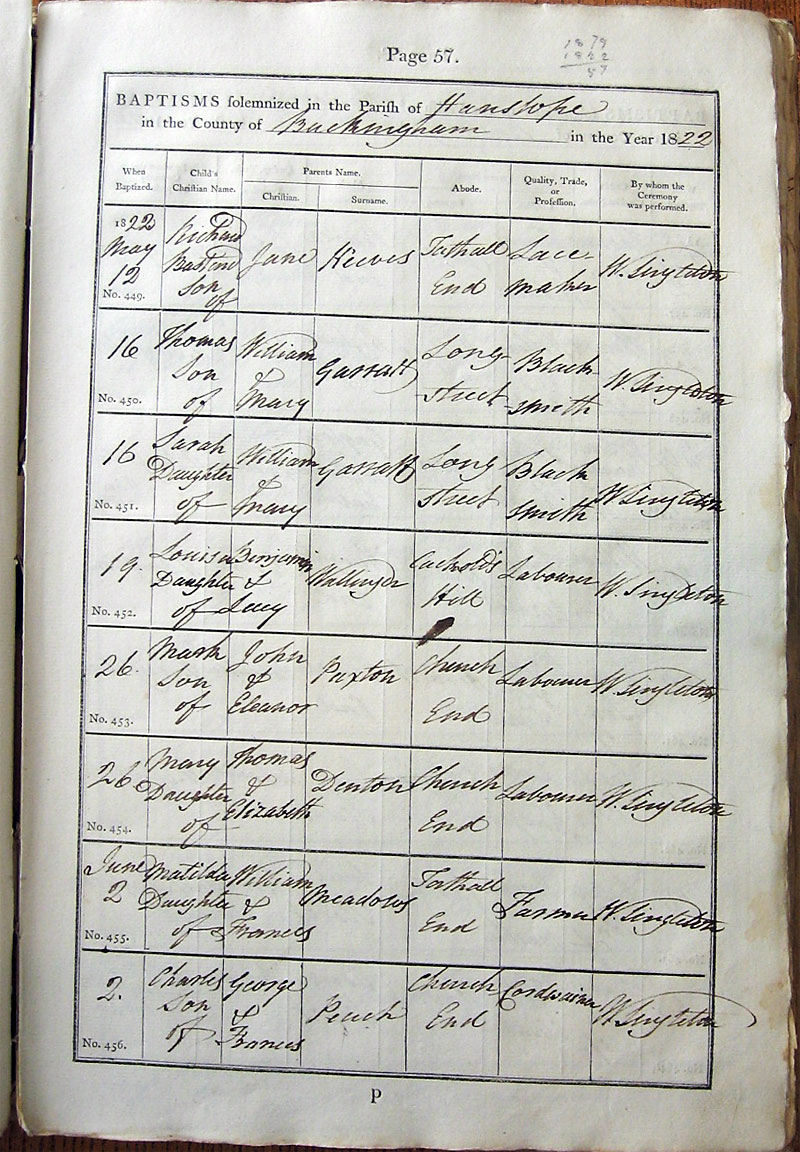 Below is a transcription and image of page 57 of the Baptism register for 1813-1845 of St. James The Great, Hanslope |