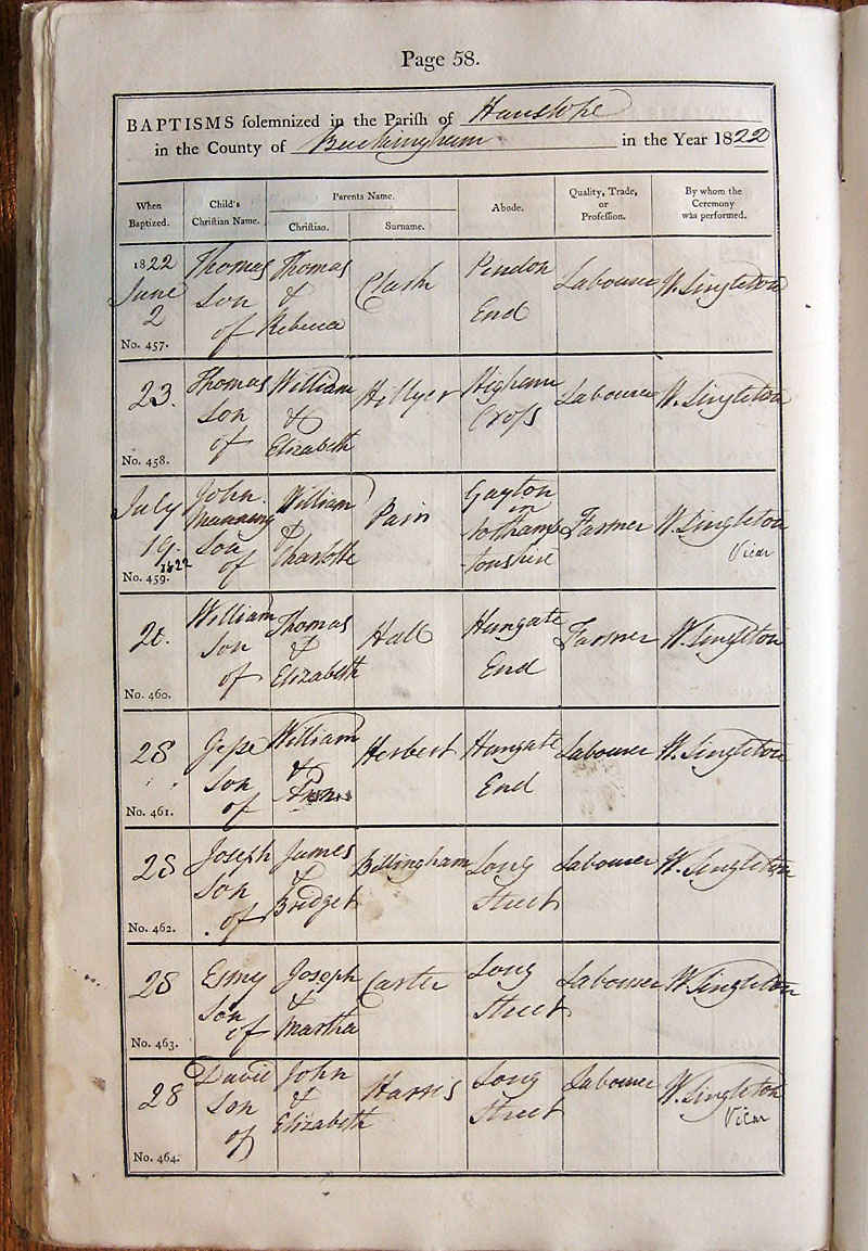Below is a transcription and image of page 58 of the Baptism register for 1813-1845 of St. James The Great, Hanslope |