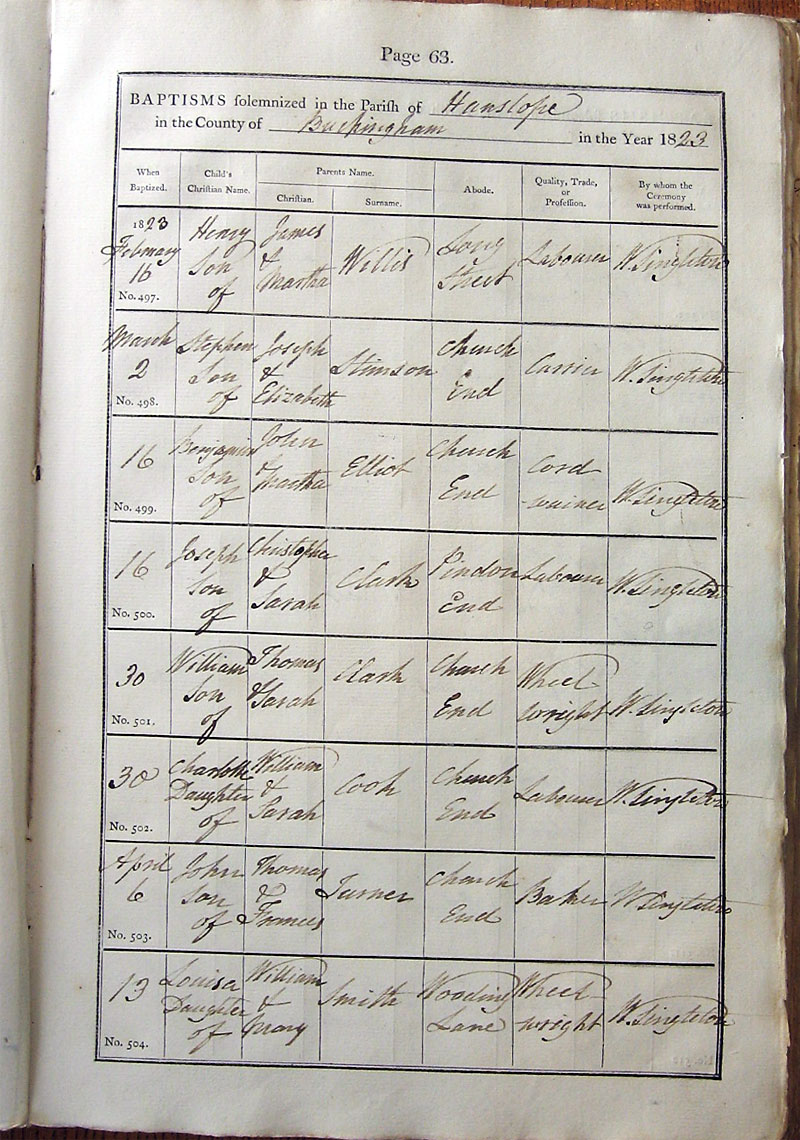 Below is a transcription and image of page 63 of the Baptism register for 1813-1845 of St. James The Great, Hanslope |