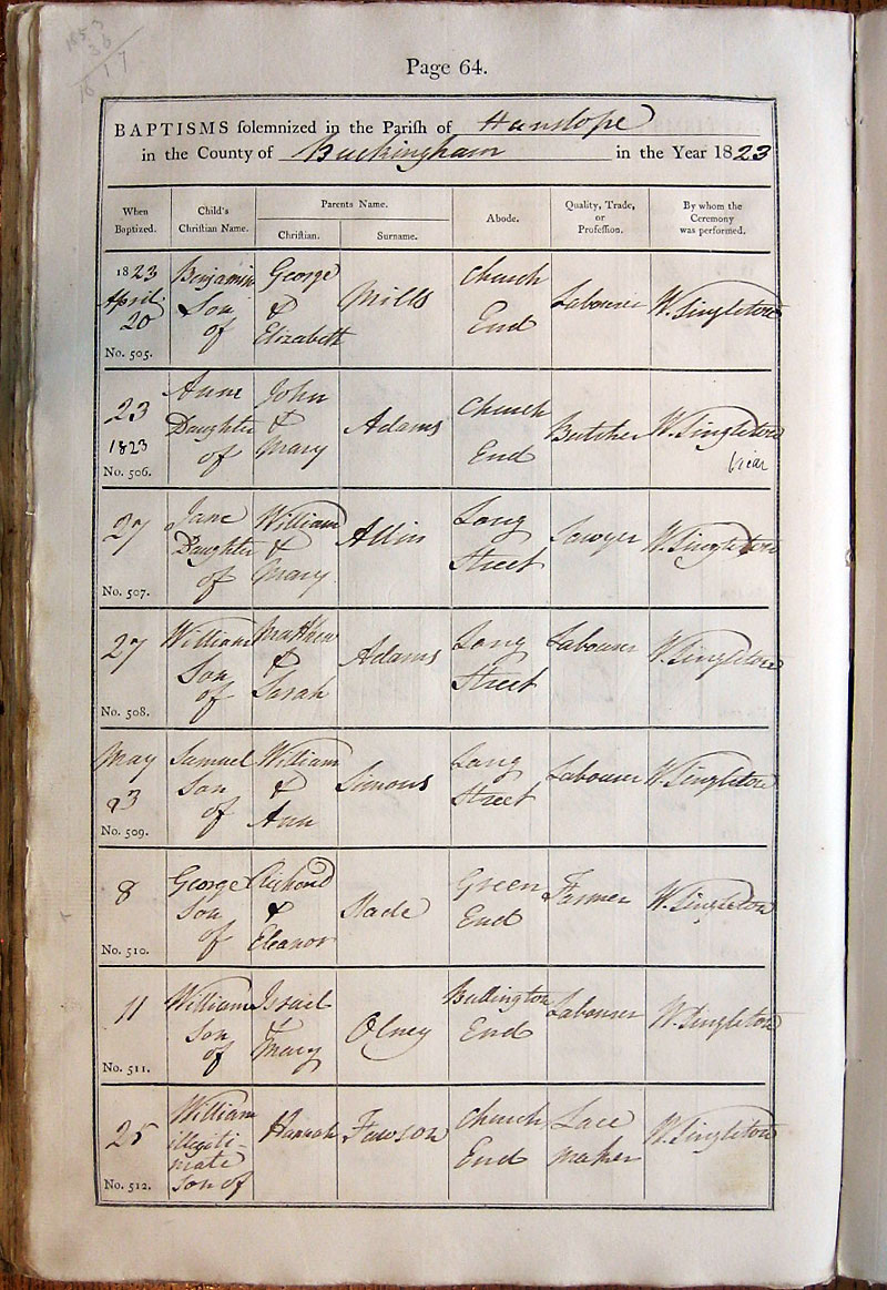 Below is a transcription and image of page 64 of the Baptism register for 1813-1845 of St. James The Great, Hanslope