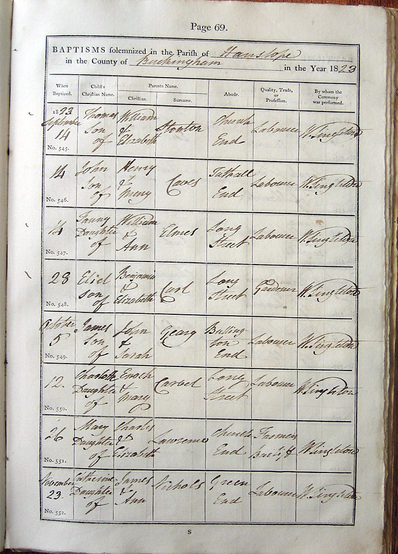 Below is a transcription and image of page 69 of the Baptism register for 1813-1845 of St. James The Great, Hanslope |