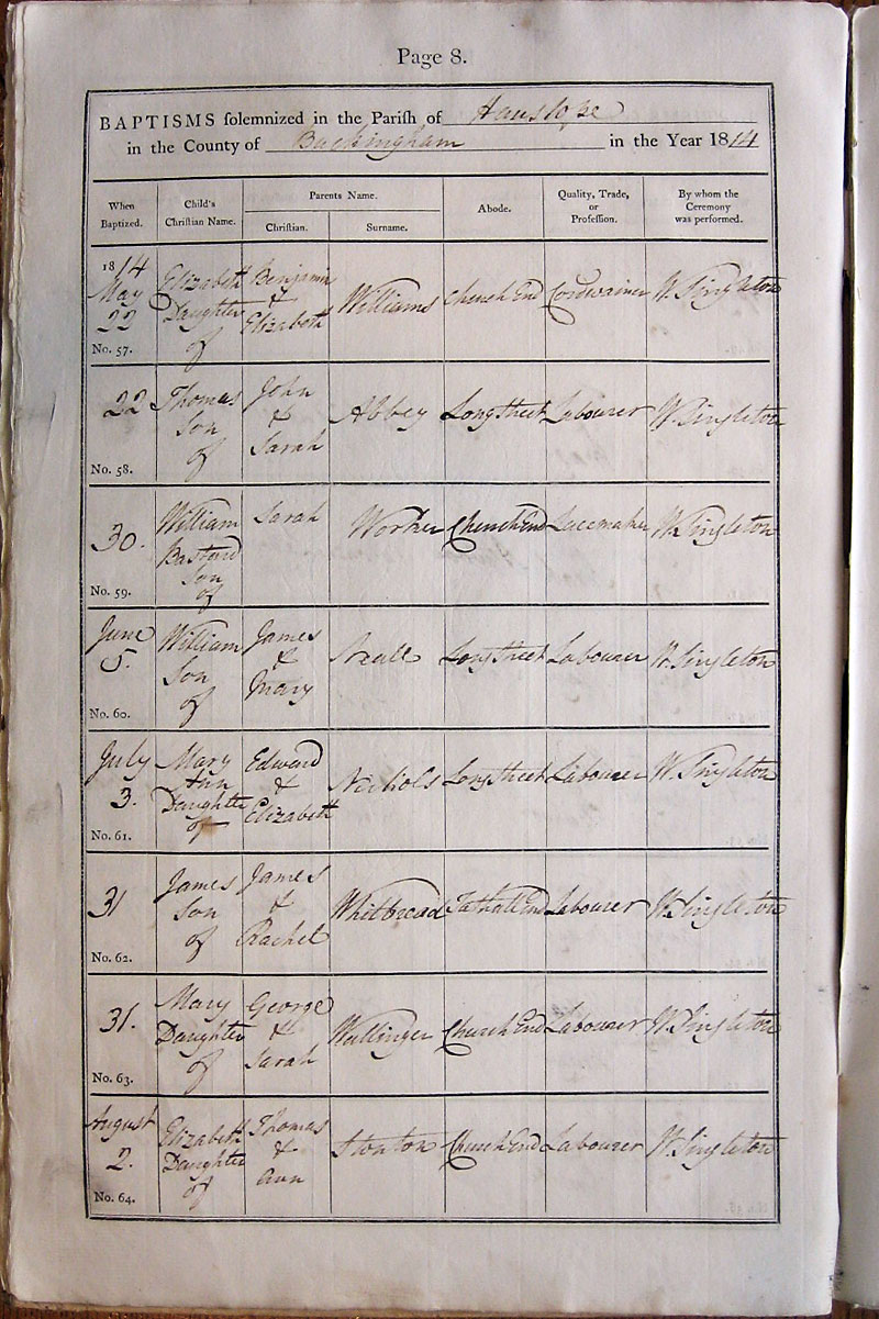 Below is a transcription and image of page 8 of the Baptism register for 1813-1845 of St. James The Great, Hanslope |