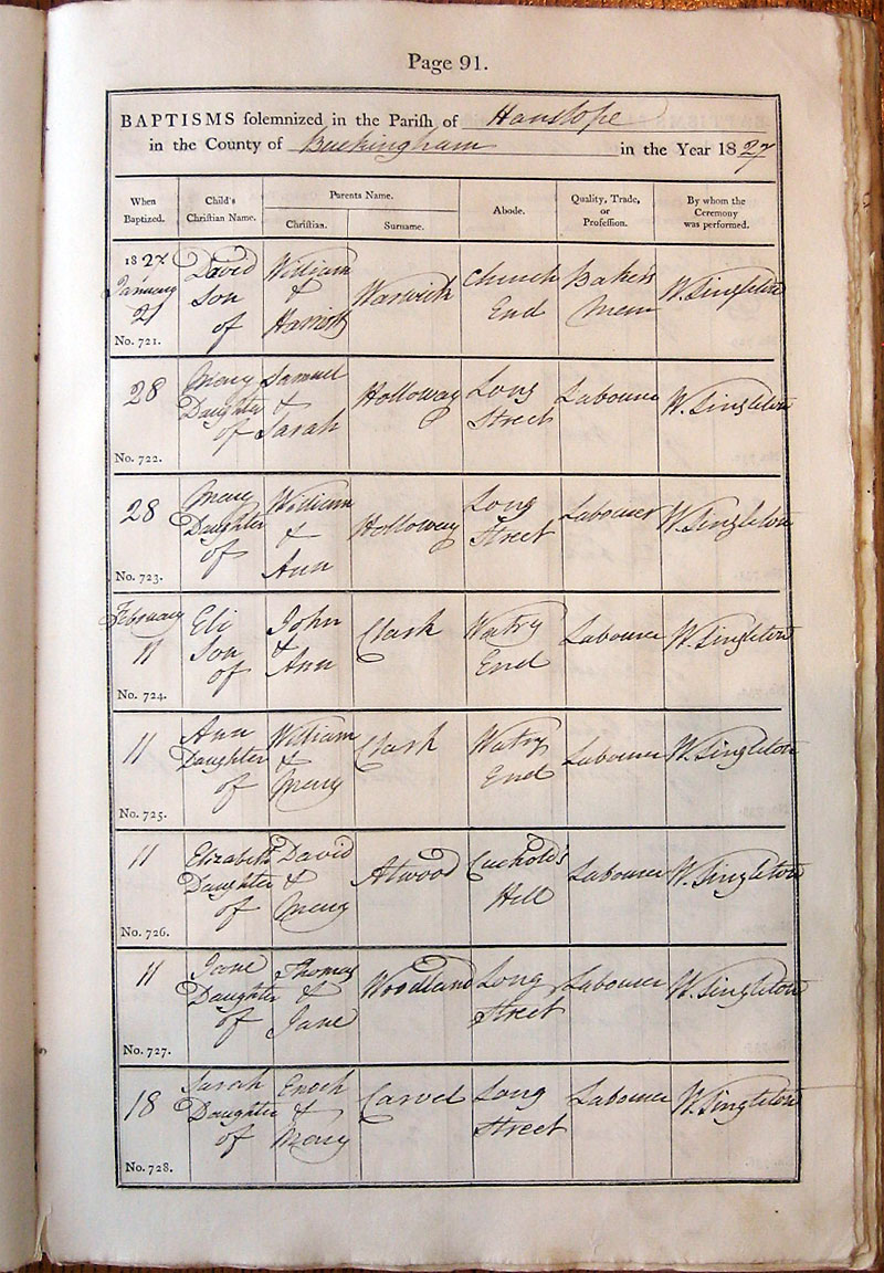 Below is a transcription and image of page 91 of the Baptism register for 1813-1845 of St. James The Great, Hanslope |