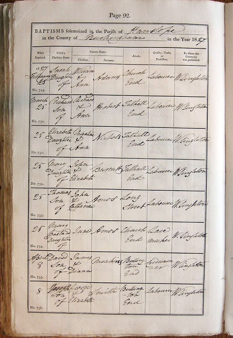 Below is a transcription and image of page 92 of the Baptism register for 1813-1845 of St. James The Great, Hanslope |