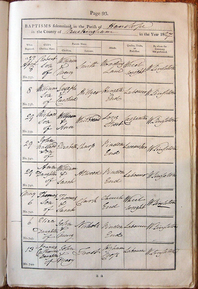 Below is a transcription and image of page 93 of the Baptism register for 1813-1845 of St. James The Great, Hanslope |