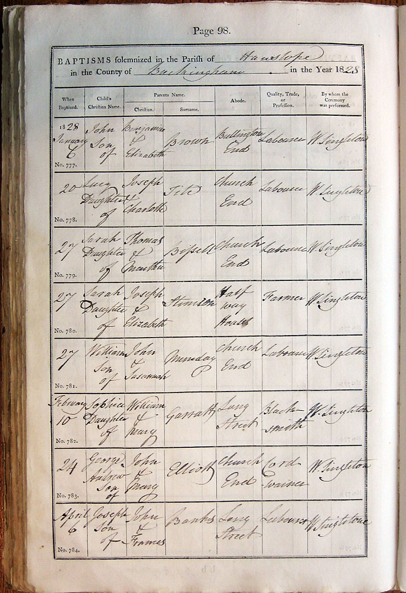 Below is a transcription and image of page 98 of the Baptism register for 1813-1845 of St. James The Great, Hanslope |