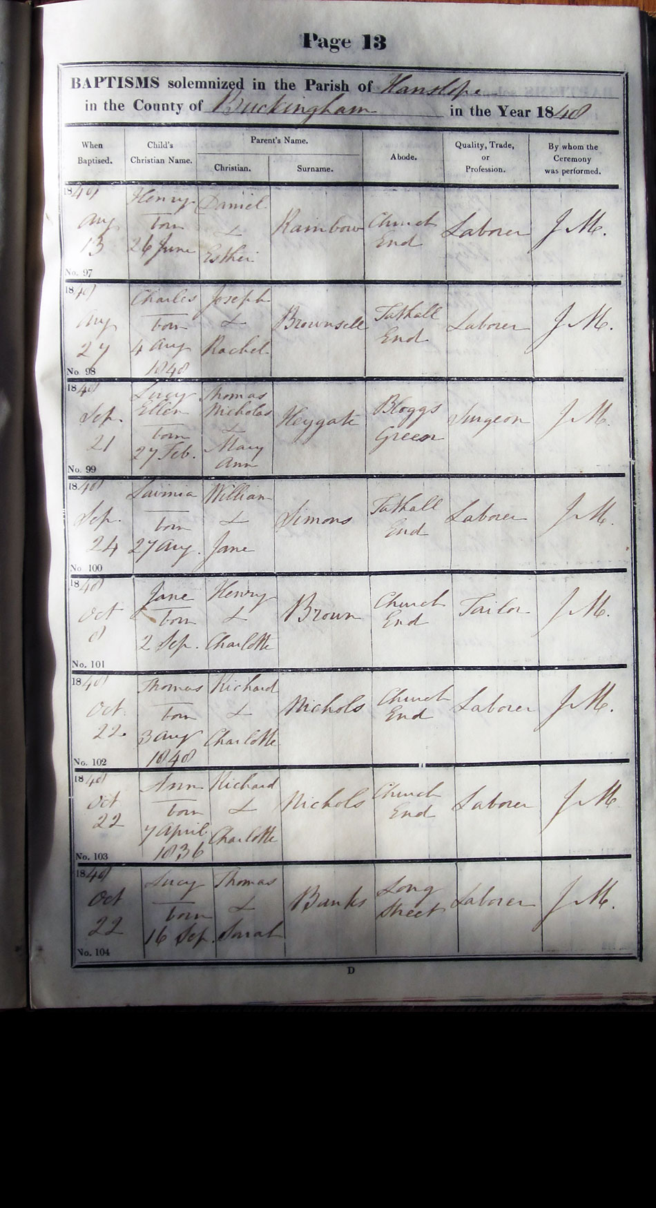 Below is a transcription and image of page 13 of the Baptism register for 1846-1863 of St. James The Great, Hanslope |