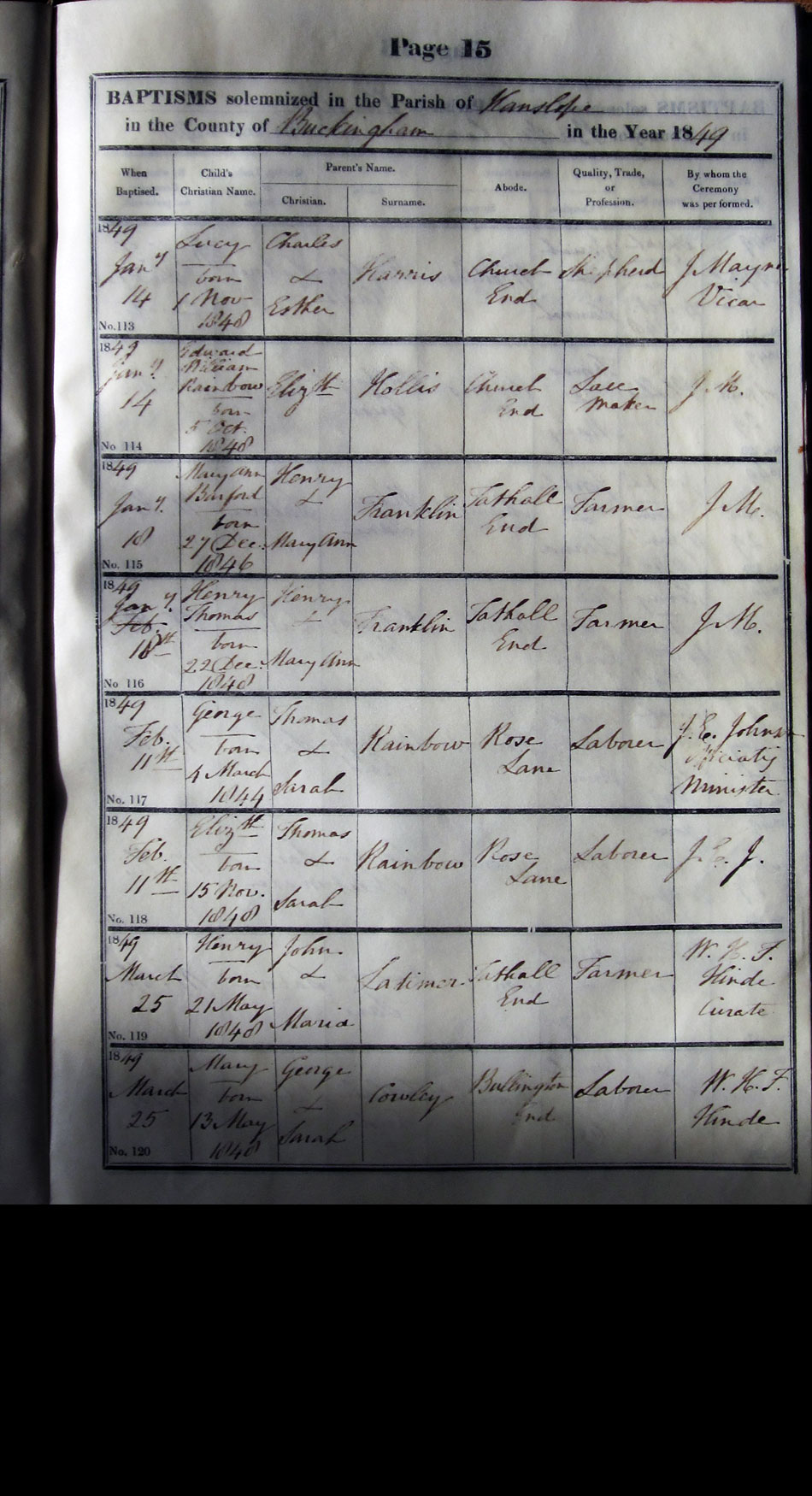 Below is a transcription and image of page 15 of the Baptism register for 1846-1863 of St. James The Great, Hanslope |