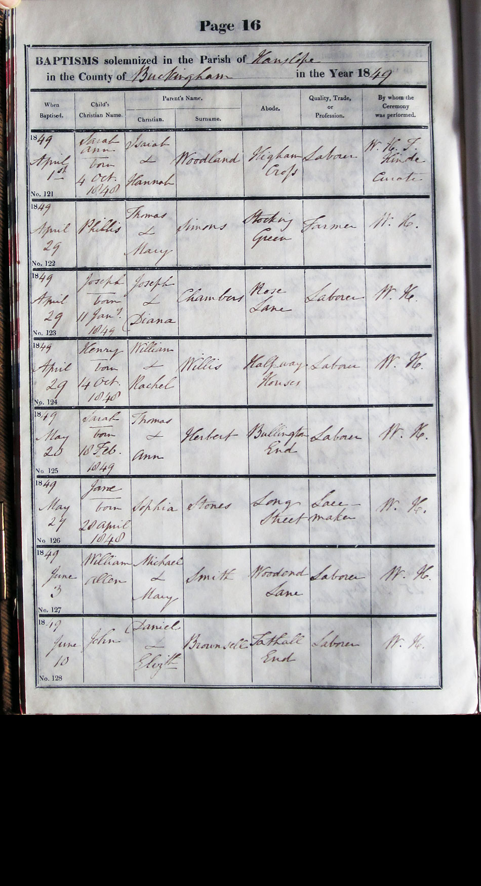 Below is a transcription and image of page 16 of the Baptism register for 1846-1863 of St. James The Great, Hanslope