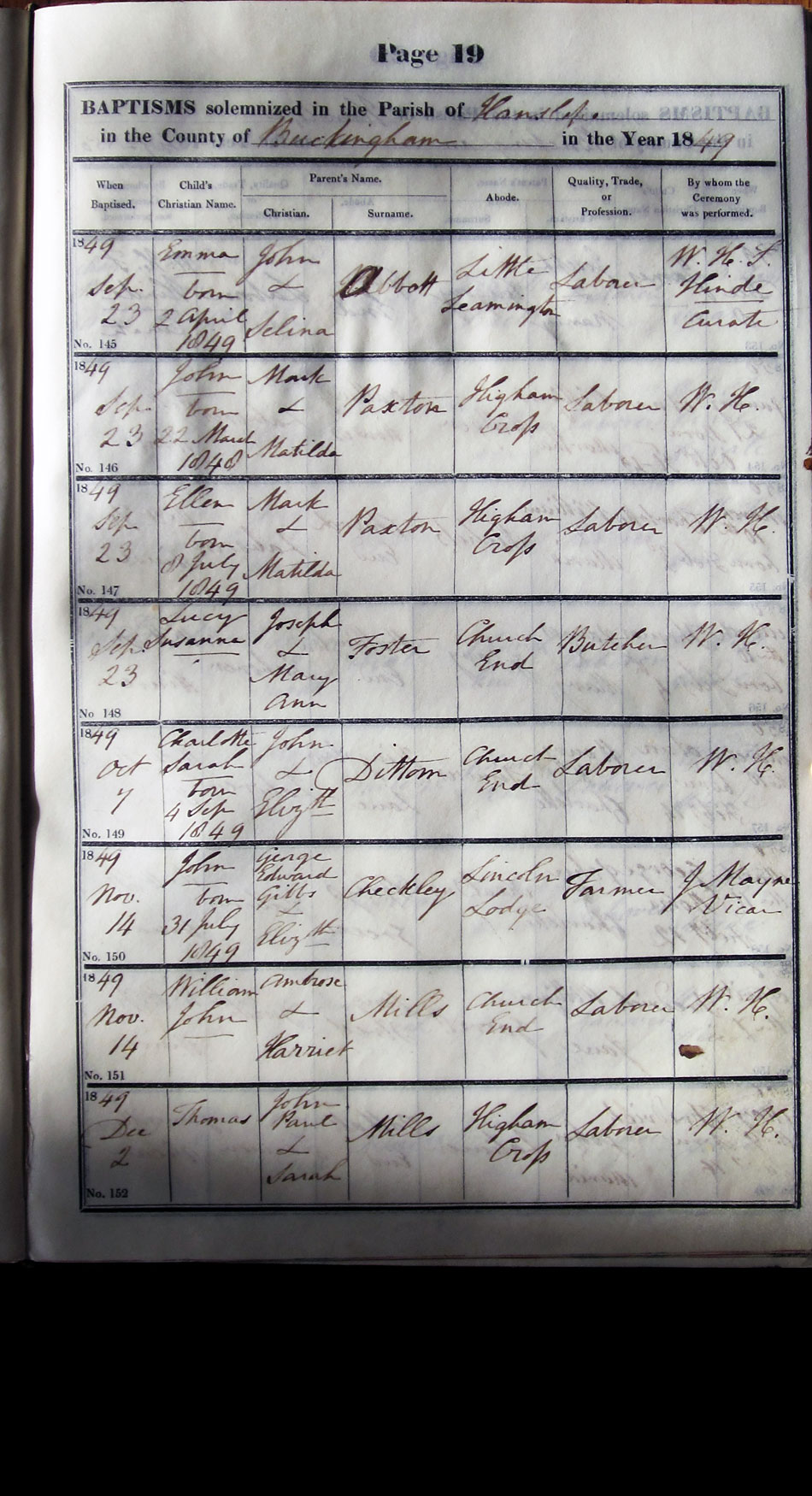 Below is a transcription and image of page 19 of the Baptism register for 1846-1863 of St. James The Great, Hanslope |