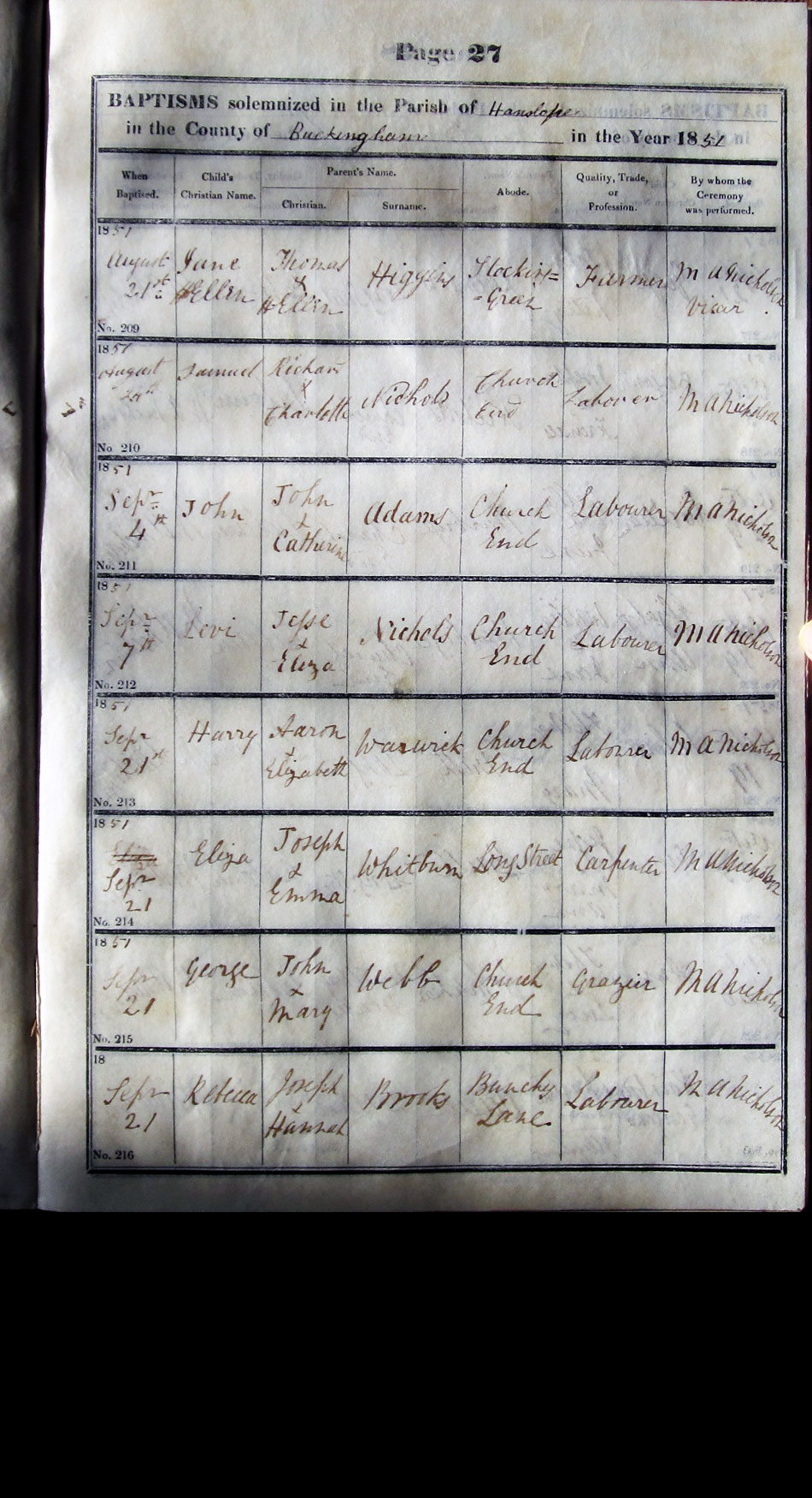 Below is a transcription and image of page 27 of the Baptism register for 1846-1863 of St. James The Great, Hanslope |