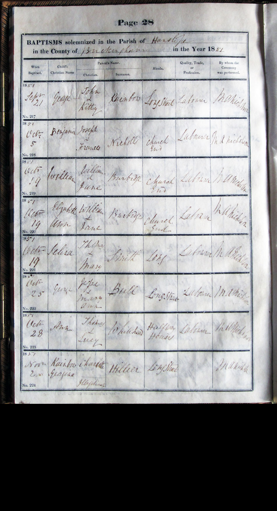 Below is a transcription and image of page 28 of the Baptism register for 1846-1863 of St. James The Great, Hanslope |