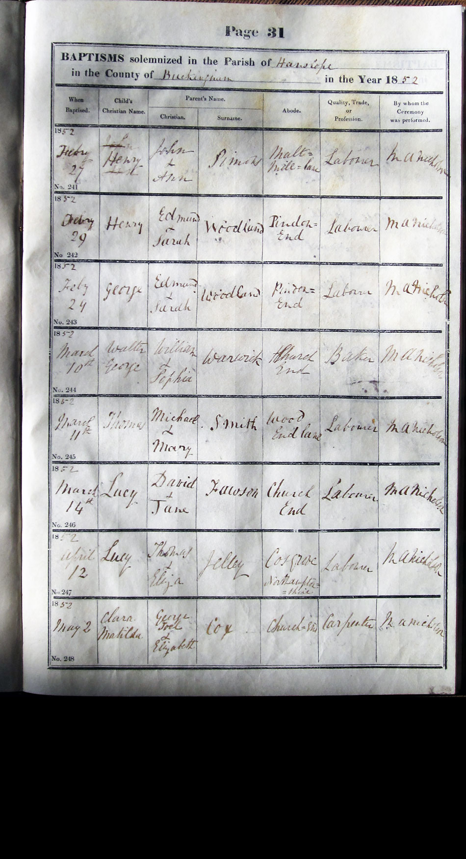 Below is a transcription and image of page 31 of the Baptism register for 1846-1863 of St. James The Great, Hanslope |