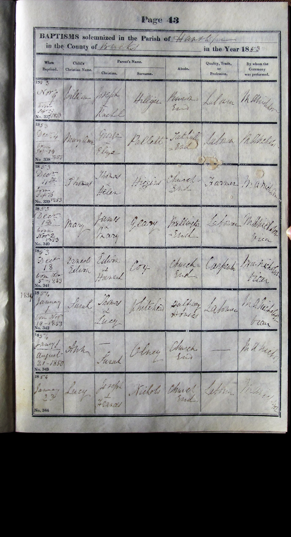 Below is a transcription and image of page 43 of the Baptism register for 1846-1863 of St. James The Great, Hanslope |