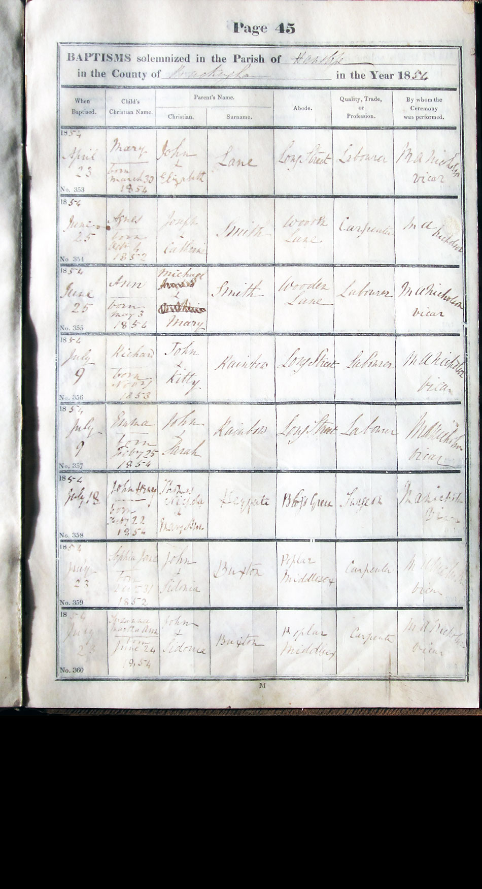 Below is a transcription and image of page 45 of the Baptism register for 1846-1863 of St. James The Great, Hanslope |
