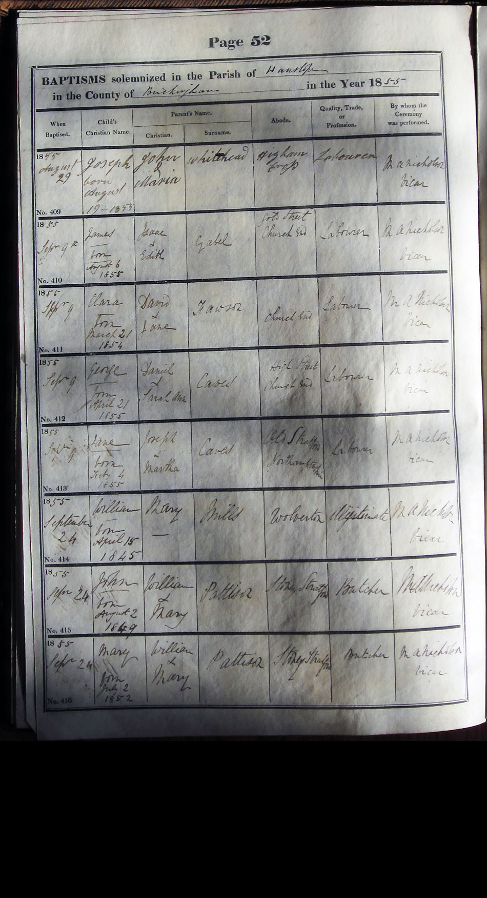 Below is a transcription and image of page 52 of the Baptism register for 1846-1863 of St. James The Great, Hanslope |