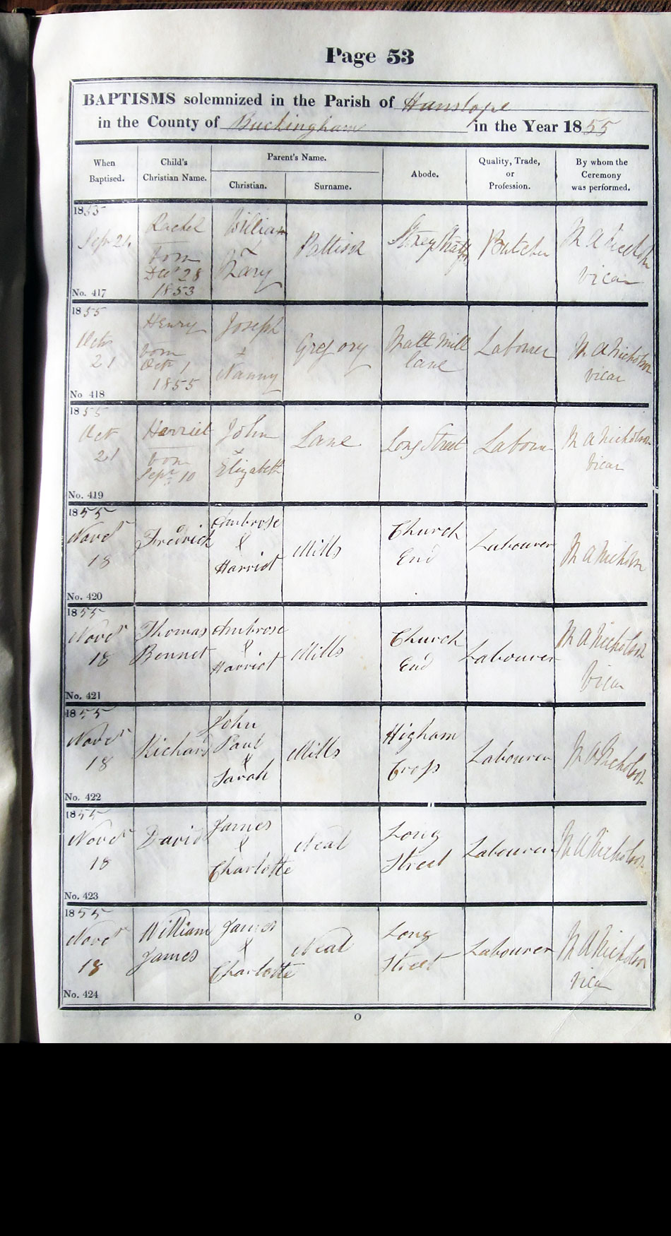 Below is a transcription and image of page 53 of the Baptism register for 1846-1863 of St. James The Great, Hanslope |