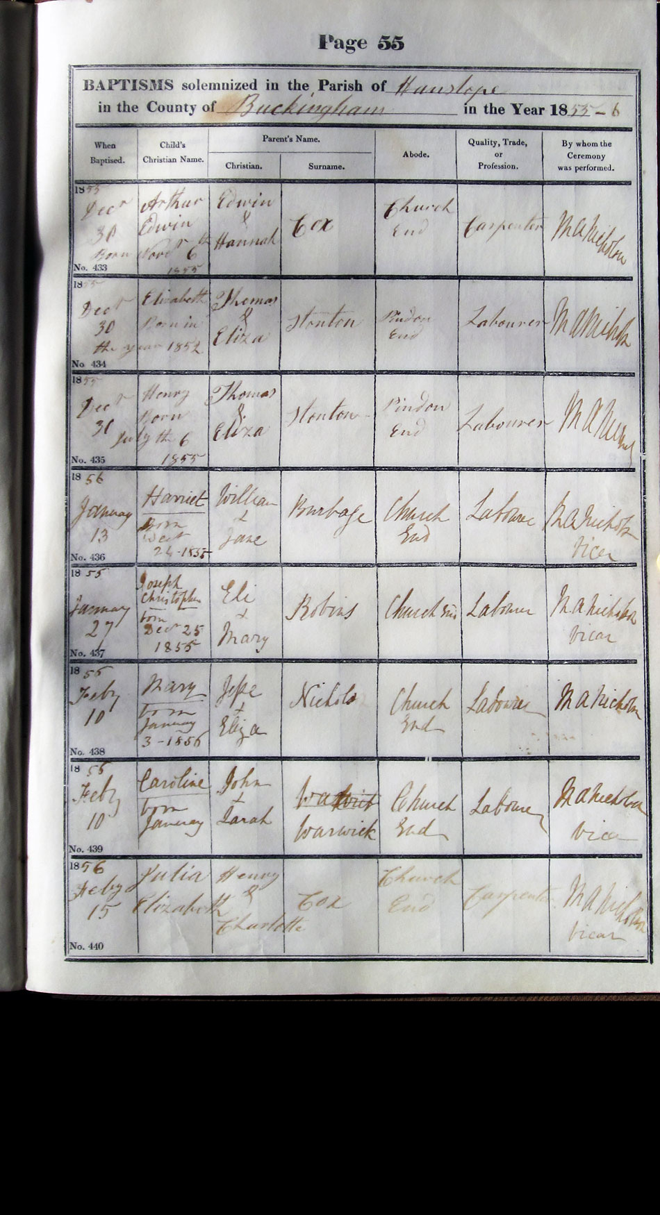 Below is a transcription and image of page 55 of the Baptism register for 1846-1863 of St. James The Great, Hanslope |